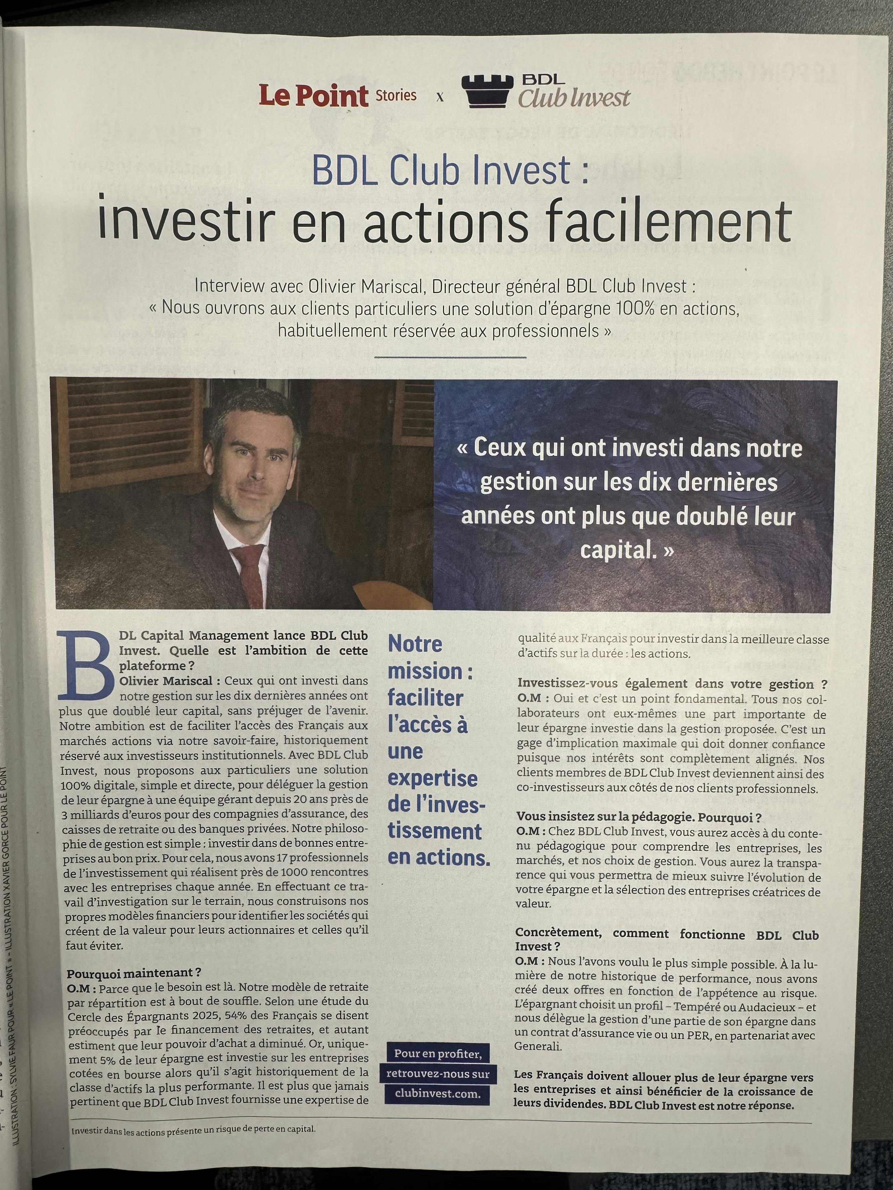 Depuis plus de 20 ans BDL Capital Management, société de gestion française et indépendante, investit dans les actions pour le compte de professionnels de la finance. BDL Club Invest s'appuie sur une équipe de 16 analystes et +1'000 rencontres entreprises par an pour vous offrir le meilleur de la gestion en actions.