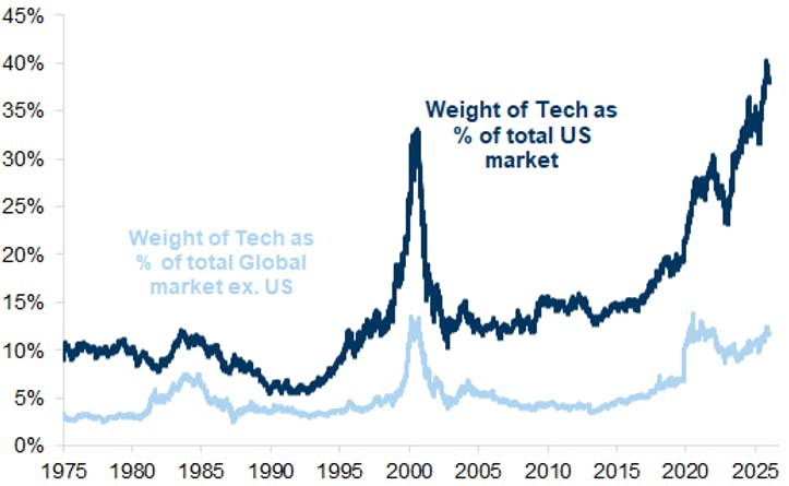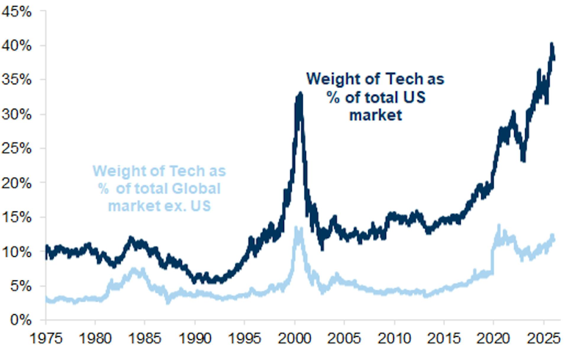 Le premier canal de transmission est boursier. Les marchés actions américains sont fortement concentrés sur la thématique de l’intelligence artificielle. Les dix principales valeurs directement exposées à l’IA représentent près de 40 % de la capitalisation du marché américain. À lui seul, ce marché représente environ 70 % du MSCI World. Une baisse des valorisations aurait donc un impact immédiat et négatif sur les indices.