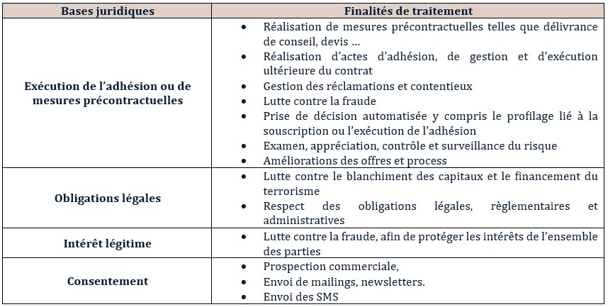 Les données ont pour finalité de satisfaire à la demande de l’Adhérent et de permettre la réalisation par le Courtier et l’Assureur de mesures précontractuelles, d’actes d’adhésion, de gestion et d’exécution ultérieure de l’adhésion y compris de profilage.