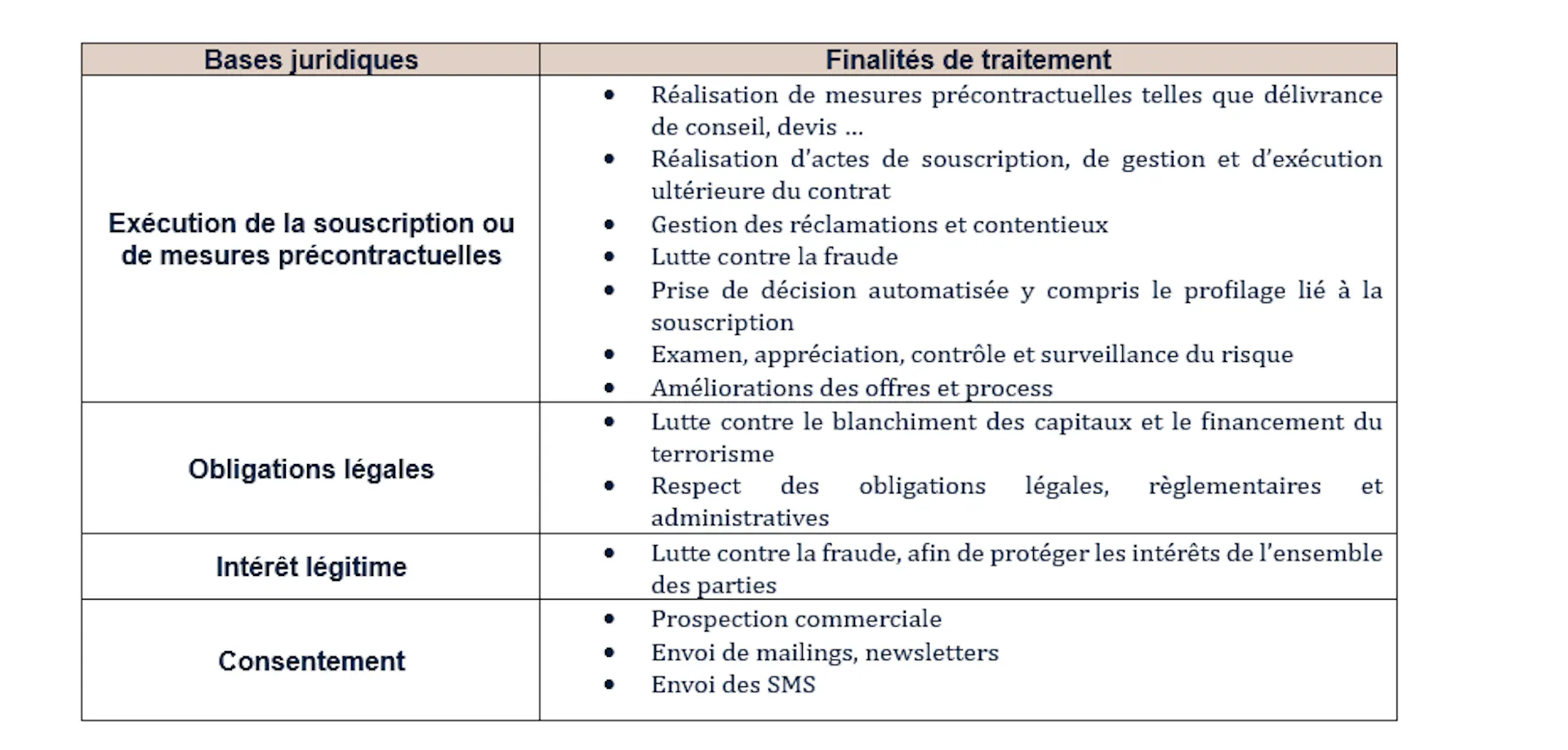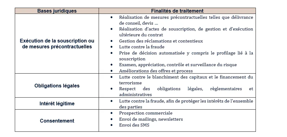Le Souscripteur trouvera ci-dessous les bases juridiques correspondant aux finalités de traitement :